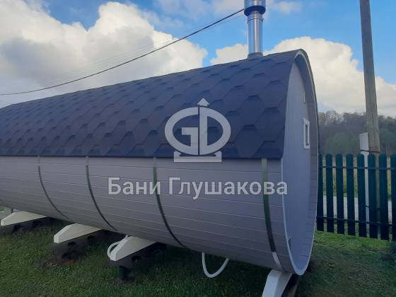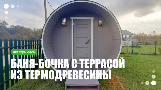 Давно не строили круглые бани — и вот отличная причина вспомнить классику! Эта баня-бочка диаметром 2,4 м и длиной 5,9 м собрана из термодревесины, что делает её особенно долговечной и устойчивой к влаге.