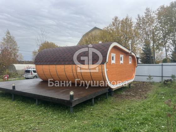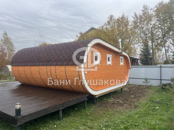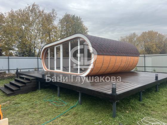 На этот раз мы построили баню «Танк Панорама» — современный вариант с панорамным остеклением и просторной террасой-подиумом.