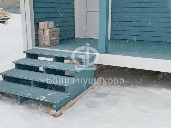 Синий цвет фасада — смелое и удачное решение. Он отлично контрастирует с зимним пейзажем и выделяет баню на фоне стандартных деревянных построек. Сейчас мы завершаем последние штрихи и готовим объект к сдаче владельцам.