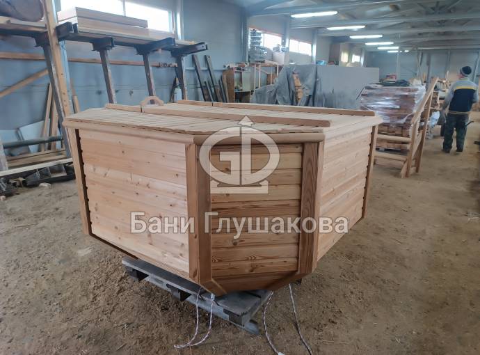 Снаружи купель обшита термомодифицированной вагонкой, которой не страшны сырость и палящее солнце. Материал по свойствам напоминает пластик.
