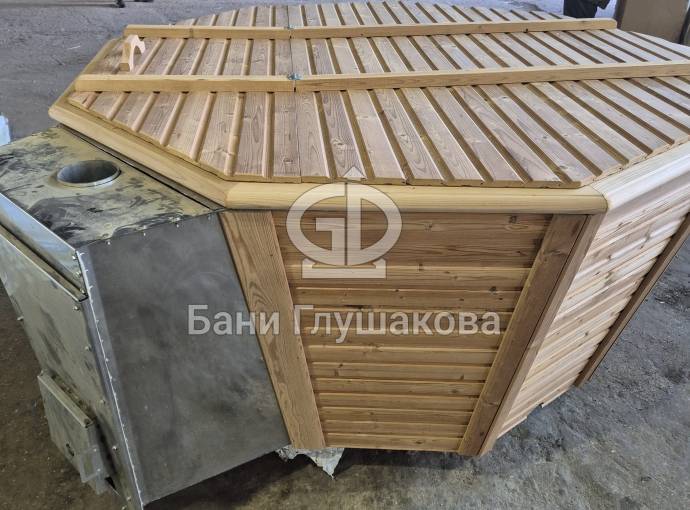 Отделка выполнена из термодревесины, устойчивой к влаге и солнцу. При желании можно покрасить в любой цвет, чтобы идеально вписать чан в дизайн участка.