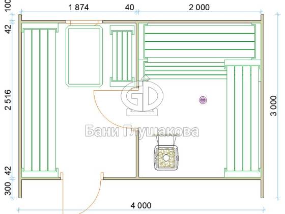 Размер универсальный – 2,4 на 6 метров, но на самом деле ограничений по размеру у бань такого типа нет – по запросу разработаем проект под ваши нужды.