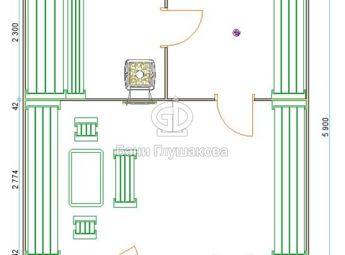 Стандартный размер проекта — 5×6 метров, однако габариты можно изменить под индивидуальные требования заказчика. Внутренняя планировка включает четыре помещения: просторную комнату отдыха, душевую, парную и отдельный санузел.