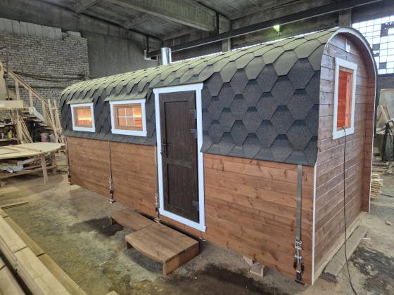 Баня изготавливается из бочковой термодоски — материала, устойчивого к перепадам температур и влаге. Она остаётся лёгкой по конструкции, но при этом рассчитана на круглогодичное использование.