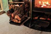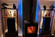 Если топка через стену то можно сделать красивые наличники из брашированной доски с полочкой на верху,