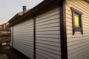 Сухая, строганная, покрашенная и только потом установленная доска внахлест одна на другую, (если это баня «Барн», то обшивается имитацией бруса), если баня «Кубота», то планкеном.