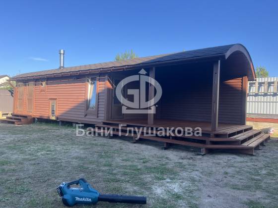 Проект «Бурже Пизанская» — это эффектная каркасная баня, в которой архитектурные детали не просто украшают, но и работают на комфорт. В её основе — фирменная округлая крыша от «Бани Глушакова», дополненная оригинальной террасой с асимметричным козырьком: стропила наклонены, а навес выступает дальше ступенек. Это решение выглядит нестандартно и в то же время практично — защищает зону отдыха от дождя и снега.