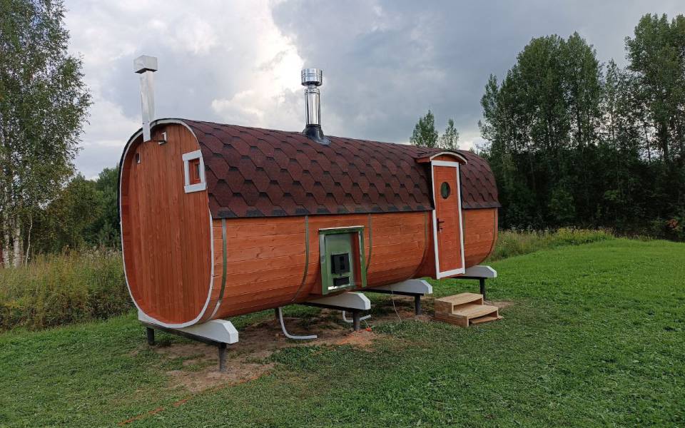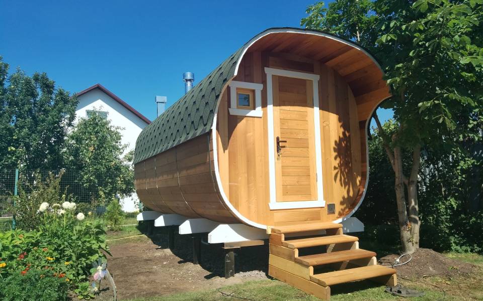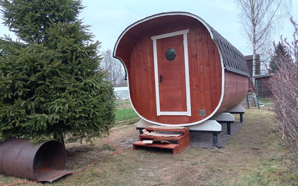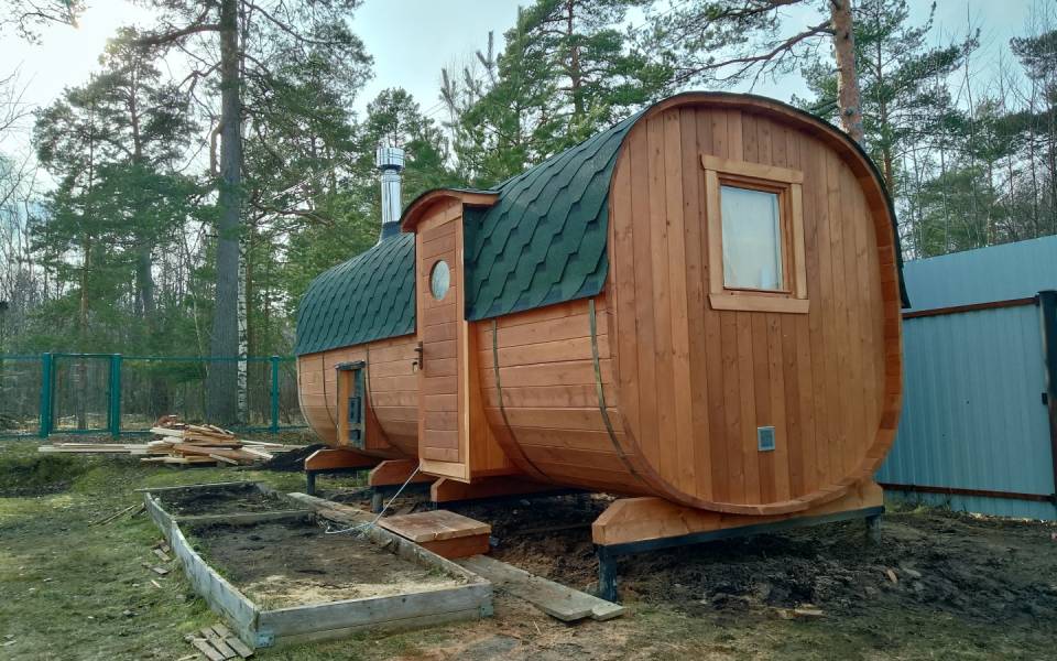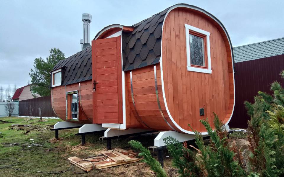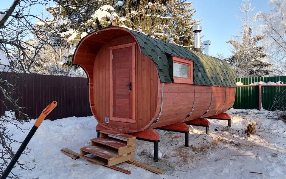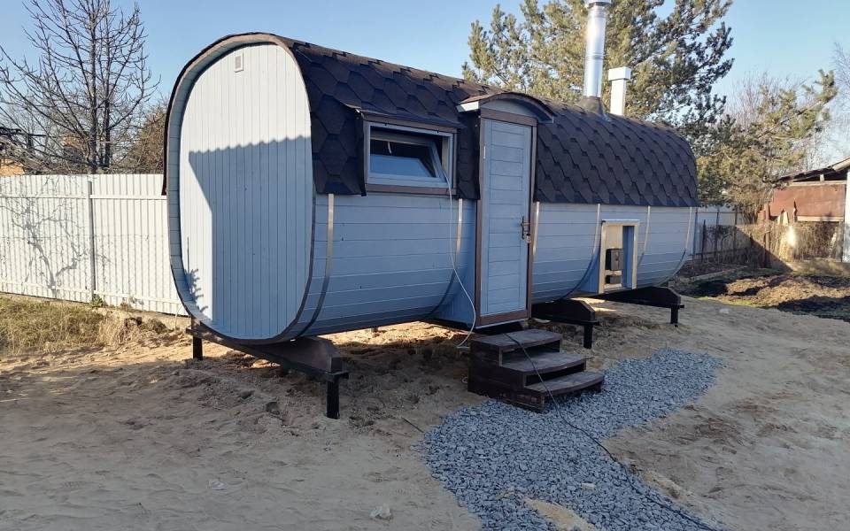 Перевозная квадробочка совмещает в себе классическую баню в виде бытовку с оригинальной круглой баней бочкой. С одной стороны конфигурация более привычная, а с другой — необычный дизайн.