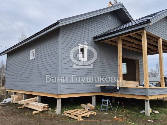 Баня полностью собрана в условиях цеха и доставлена к клиенту на участок в готовом виде.